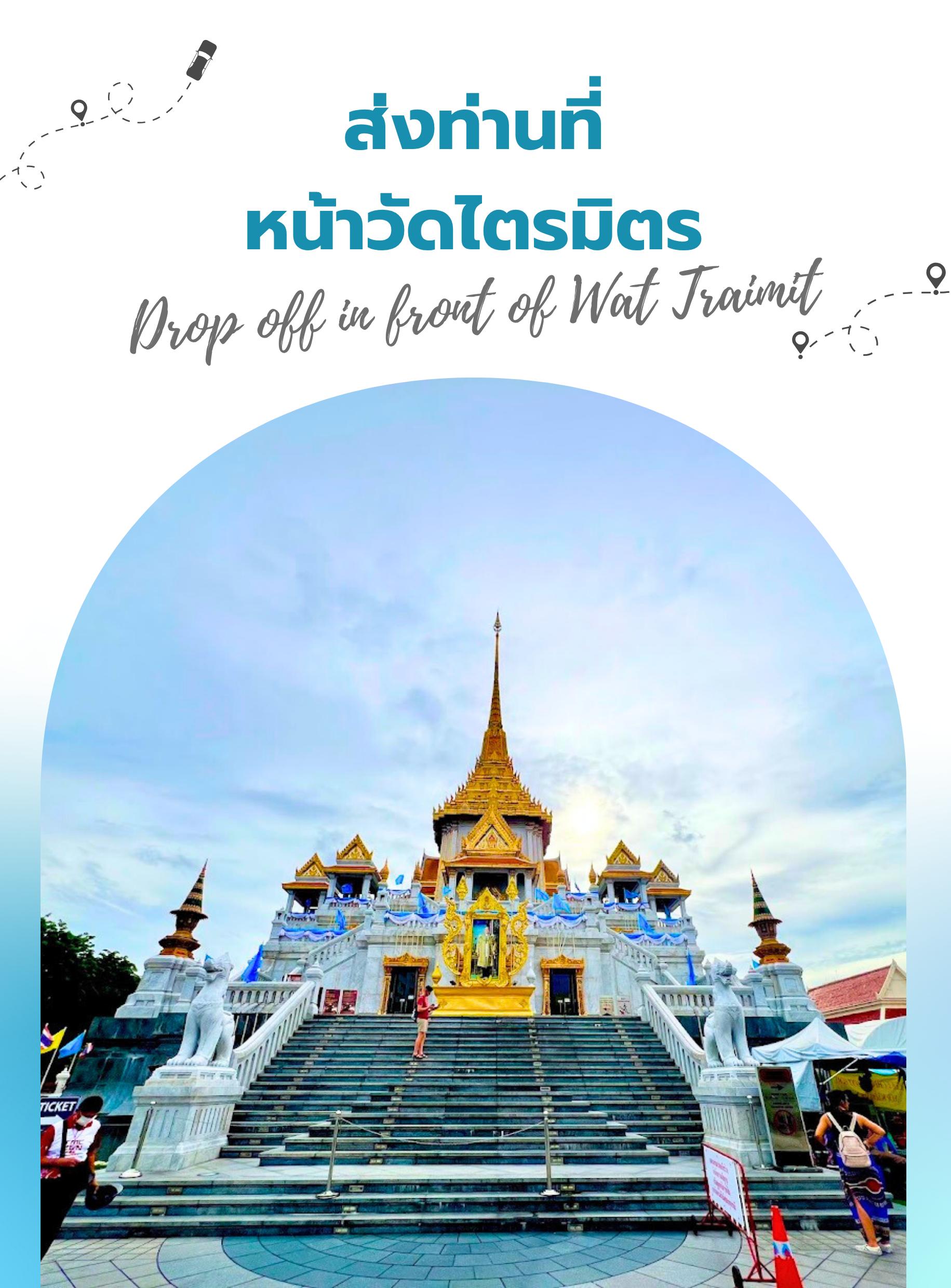 After your visit and taking a picture, your guide will kindly escort you to the front of Wat Traimit Withayaram where your tour program will conclude. Thank you for choosing our service, and we hope you had a wonderful experience!