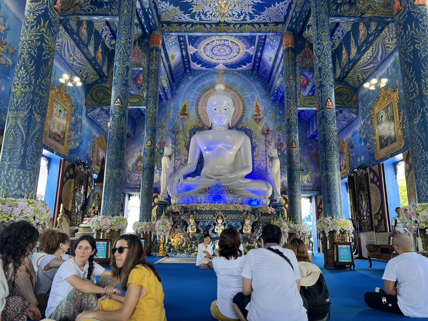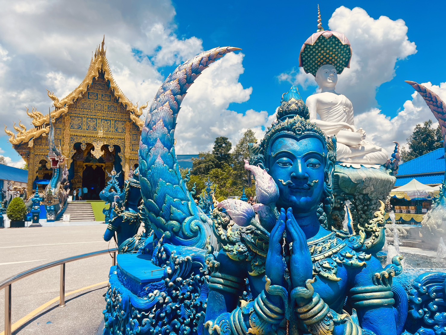 2. 롱쑤어텡 사원 방문: 과거에 폐허였던 이 사원은 지역 주민들의 노력으로 재건되었습니다. 사원은 파란색과 금색이 조화를 이루는 독특한 건축 양식을 자랑하며, 내부에는 흰색의 주요 불상이 안치되어 있습니다. 이 사원은 현지 예술가인 푸타 깝깨우(슬라녹)가 설계하였으며, 그의 스승인 아자른 차렘차이 코싯피팟의 영향을 받았습니다.