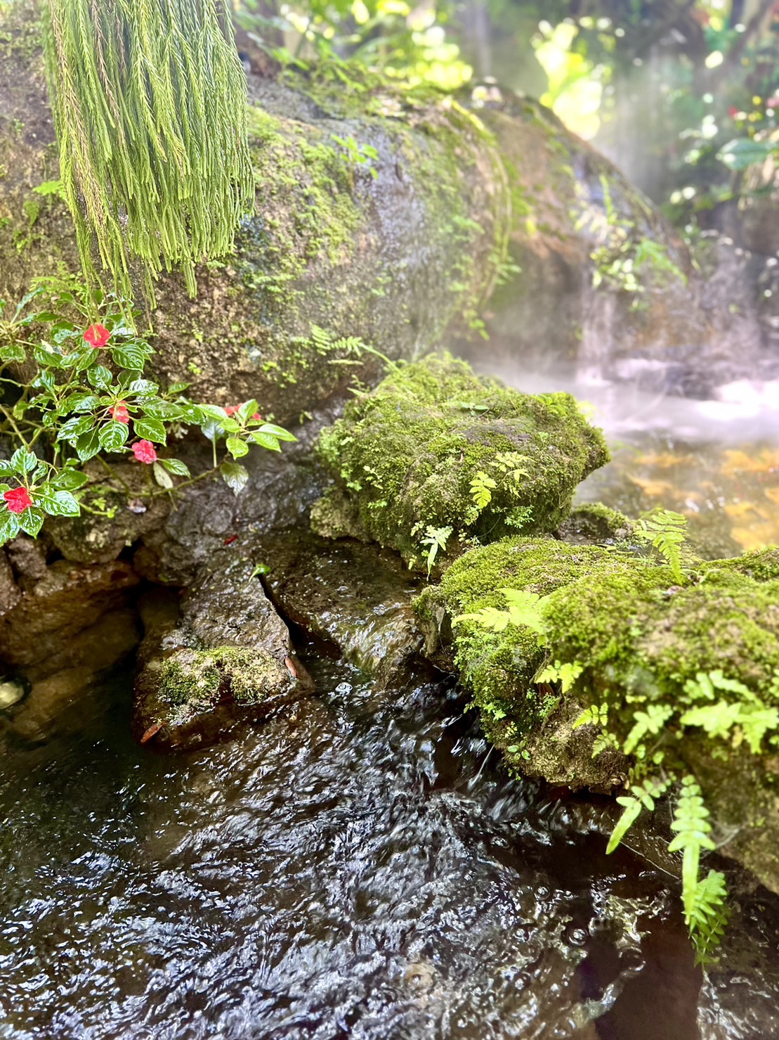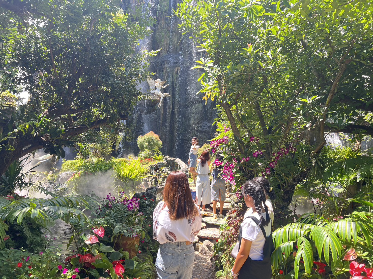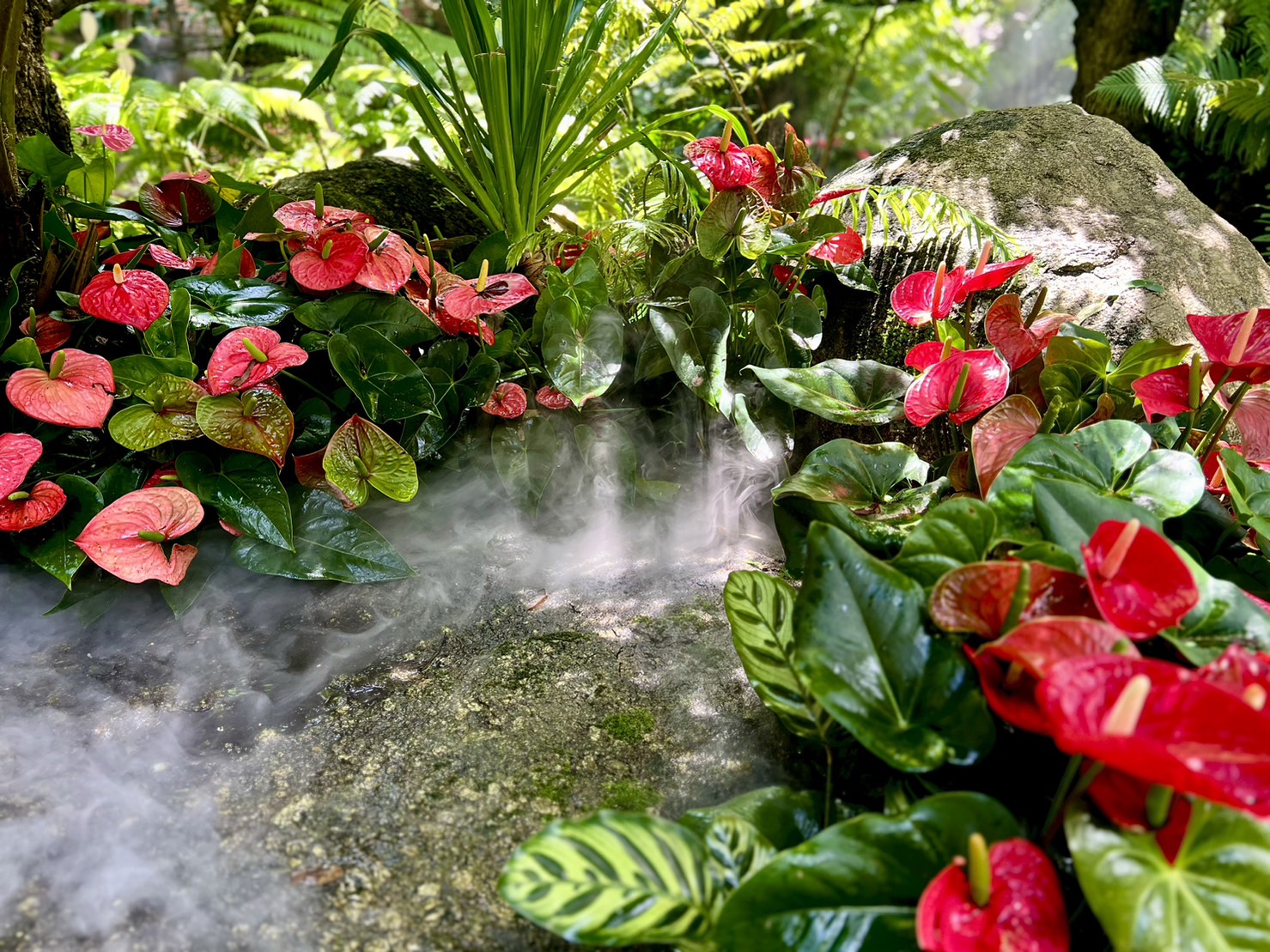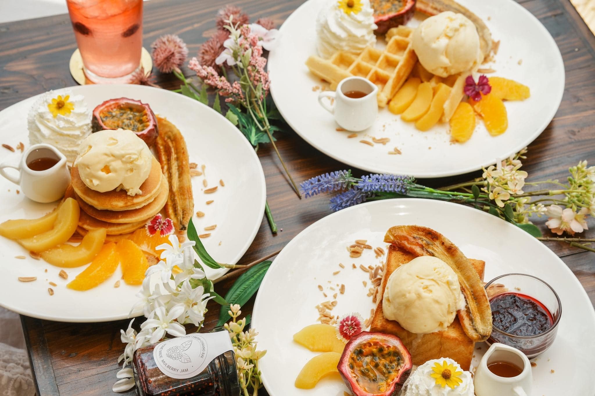 다양한 꽃들로 둘러싸인 시원하고 그늘진 카페이며, 히말라야 숲을 모티브로 상상 속의 신화적인 스타일로 꾸며져 있습니다.
