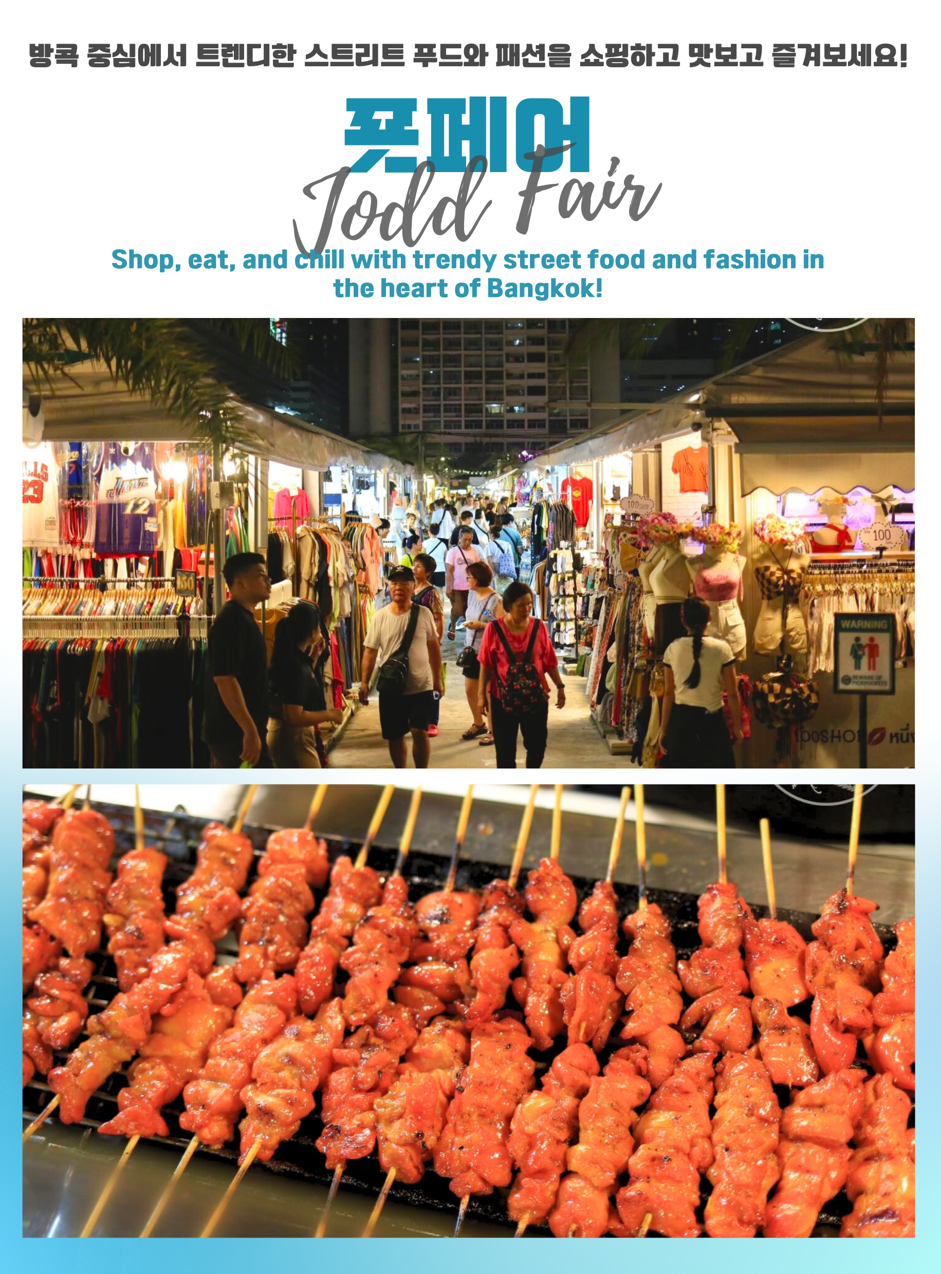 BTS 전철을 타고 ** 조드 페어 마켓 방문 조드 페어 마켓은 방콕의 인기 있는 야시장으로, 다양한 음식과 패션 아이템을 저렴한 가격에 구입할 수 있는 곳입니다. 또한, 태국의 문화와 음식을 경험할 수 있는 좋은 장소입니다.