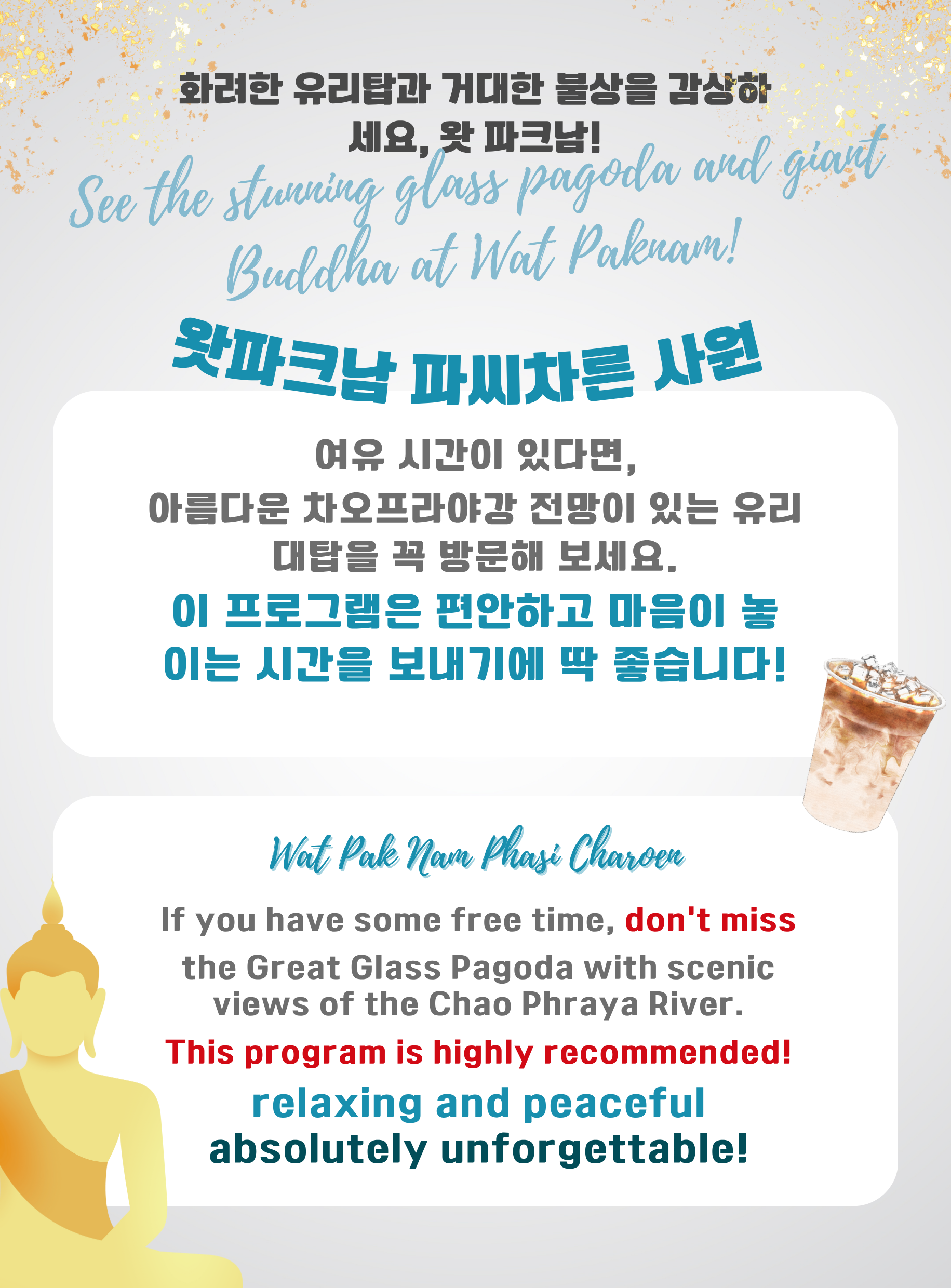 아이콘 시암 방문 후 가이드는 예약하신 호텔로 모셔다 드리며 투어가 종료됩니다. 저희 서비스를 이용해 주셔서 감사드리며, 멋진 경험을 하셨기를 바랍니다!