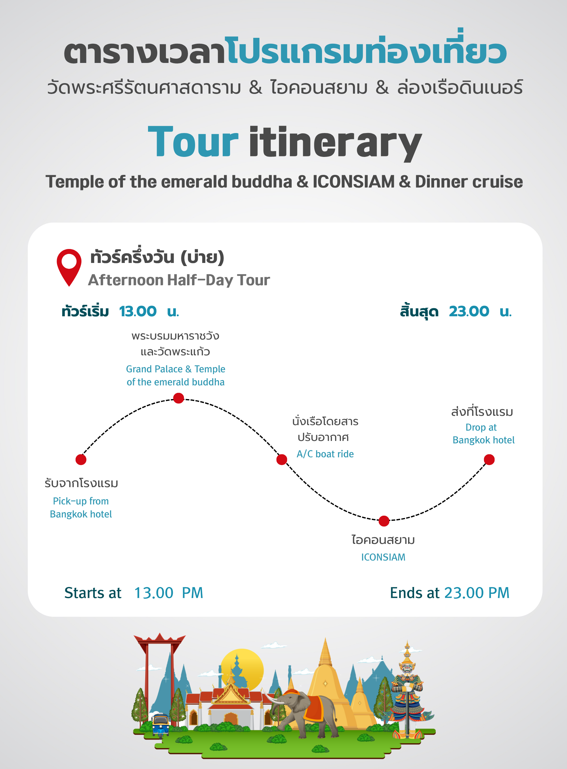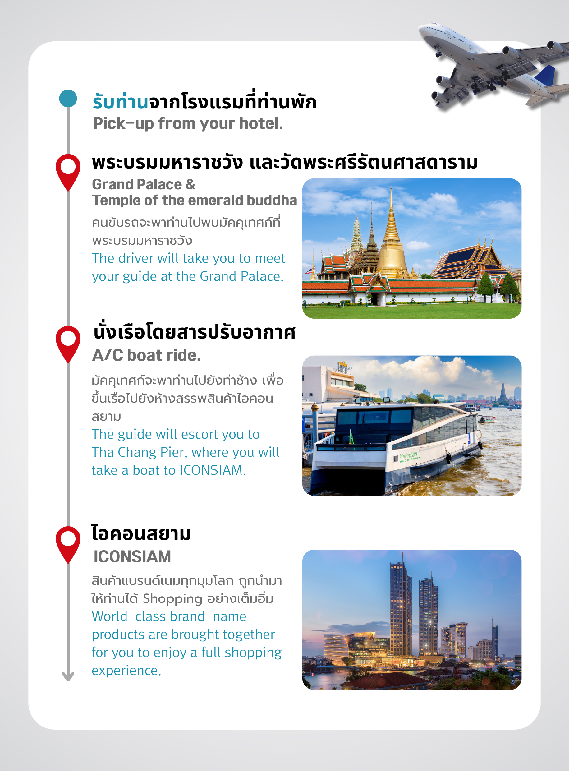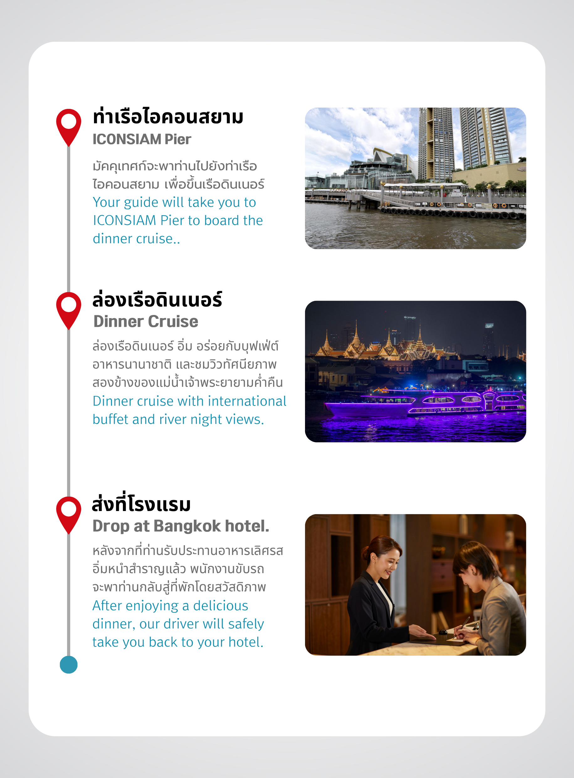 หลังจากการเที่ยวชมและถ่ายรูปสถานที่ต่าง ๆ เรียบร้อยแล้ว มัคคุเทศก์จะส่งท่านที่ท่าเรือไอคอนสยาม
