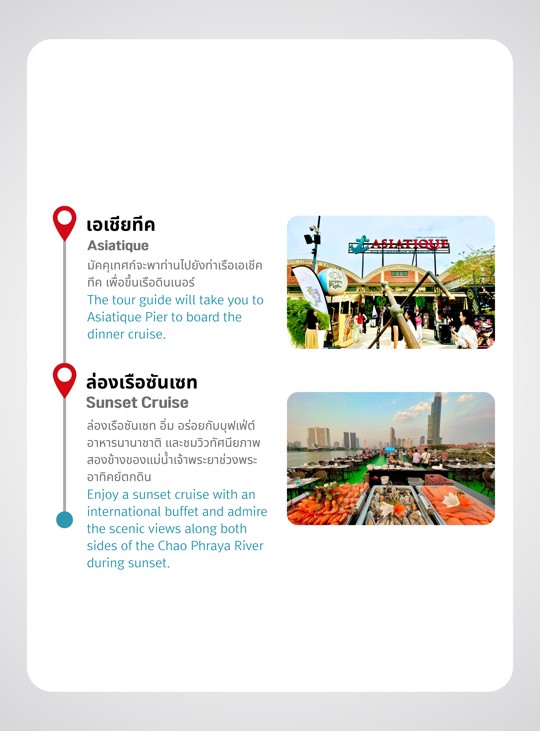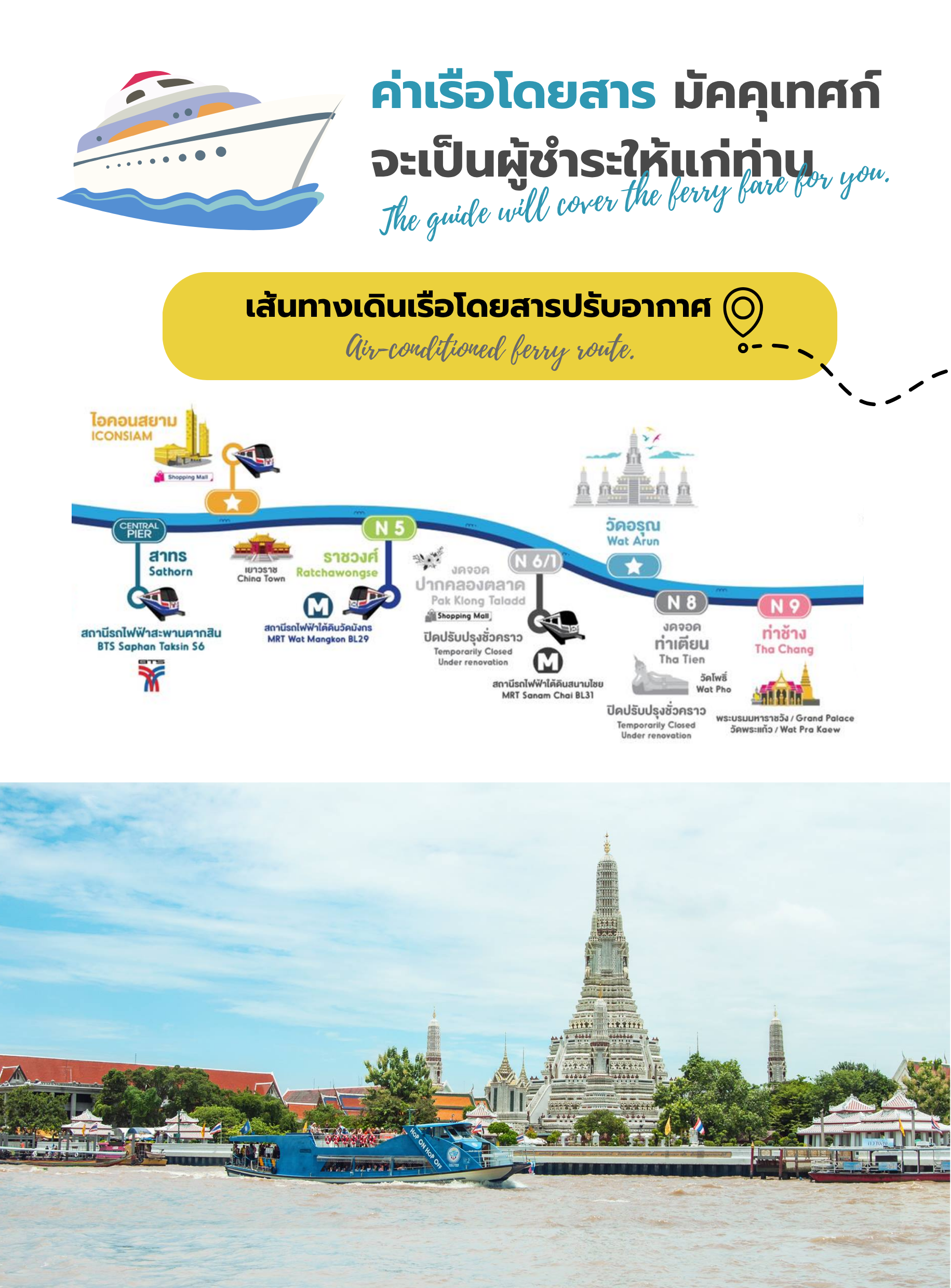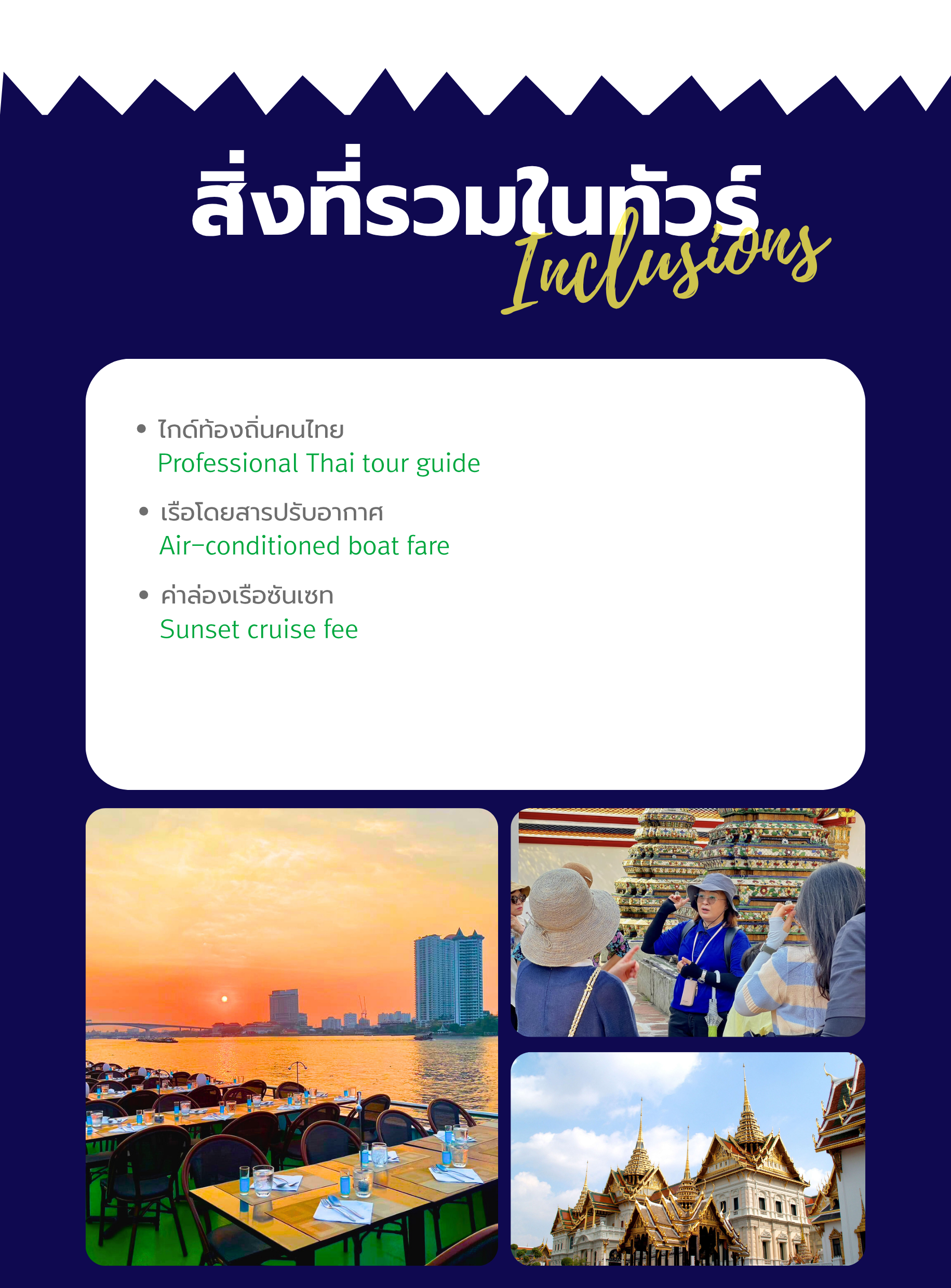 ดินเนอร์ชมพระอาทิตย์ตกบนเรือสำราญหรูริมแม่น้ำเจ้าพระยา ล่องเรือผ่านแลนด์มาร์กที่มีชื่อเสียง เช่น สะพานพระรามที่ 1, วัดกัลยาณมิตรวรมหาวิหาร (วัดพระใหญ่), วัดอรุณราชวราราม (วัดอรุณ), พระบรมมหาราชวัง ฯลฯ