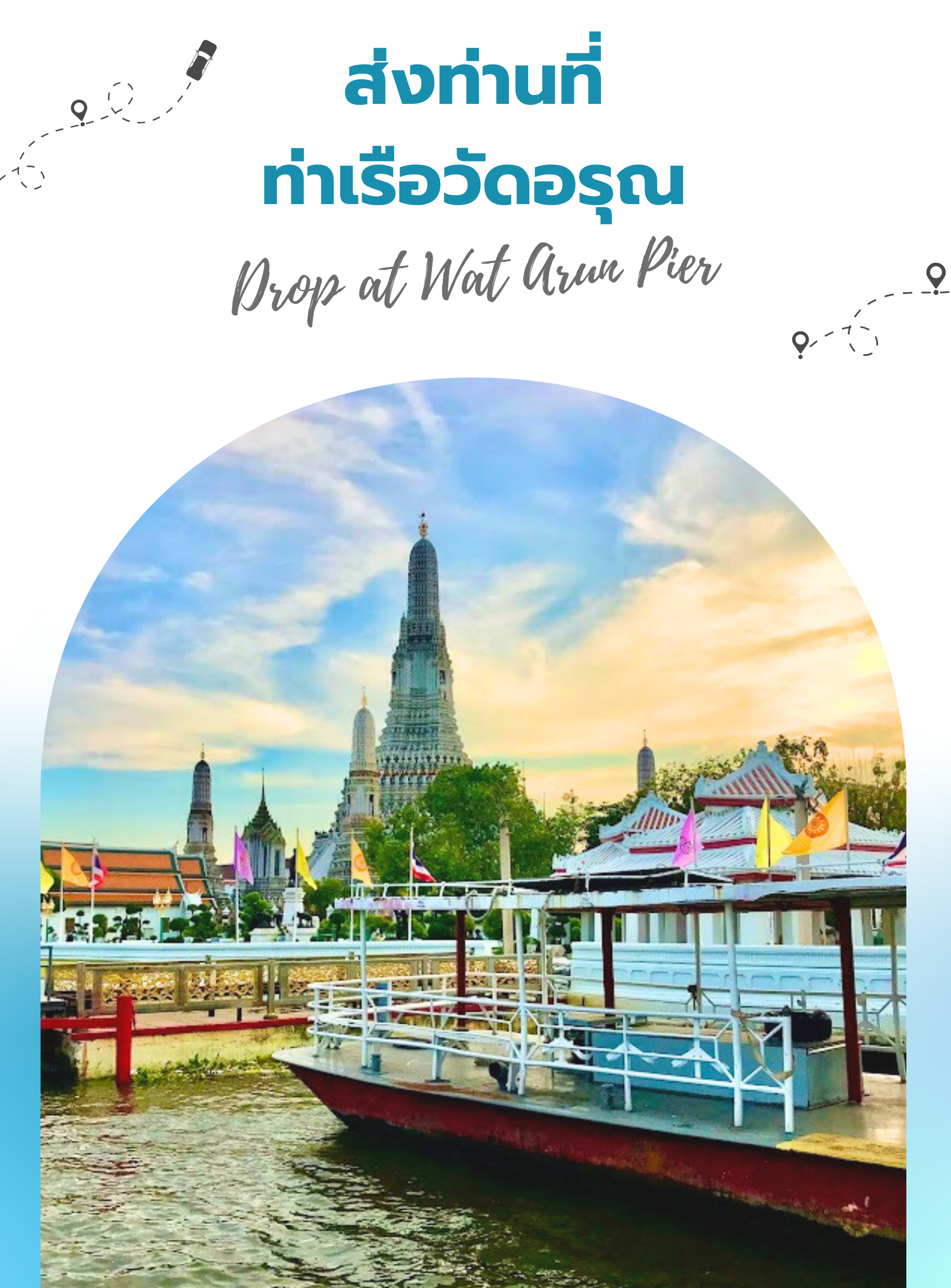 หลังจากการเที่ยวชมวัดอรุณเรียบร้อยแล้ว มัคคุเทศก์จะส่งท่านที่ท่าเรือวัดอรุณ ก็เป็นอันเสร็จสิ้นโปรแกรมทัวร์