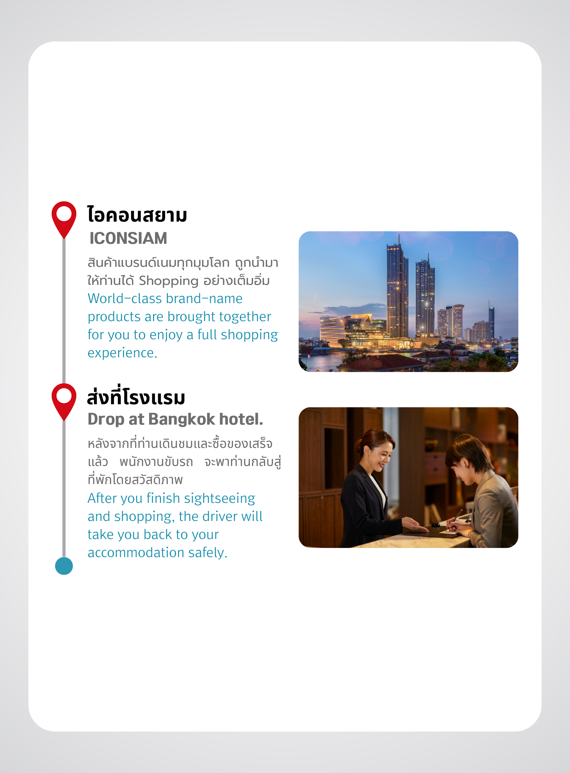 หลังจากเยี่ยมชมไอคอนสยามแล้ว ไกด์จะพาคุณไปส่งที่โรงแรมที่คุณจองไว้ ซึ่งเป็นจุดสิ้นสุดโปรแกรมทัวร์ของคุณ ขอขอบคุณที่เลือกใช้บริการของเรา และหวังว่าคุณจะมีประสบการณ์ที่ยอดเยี่ยม!