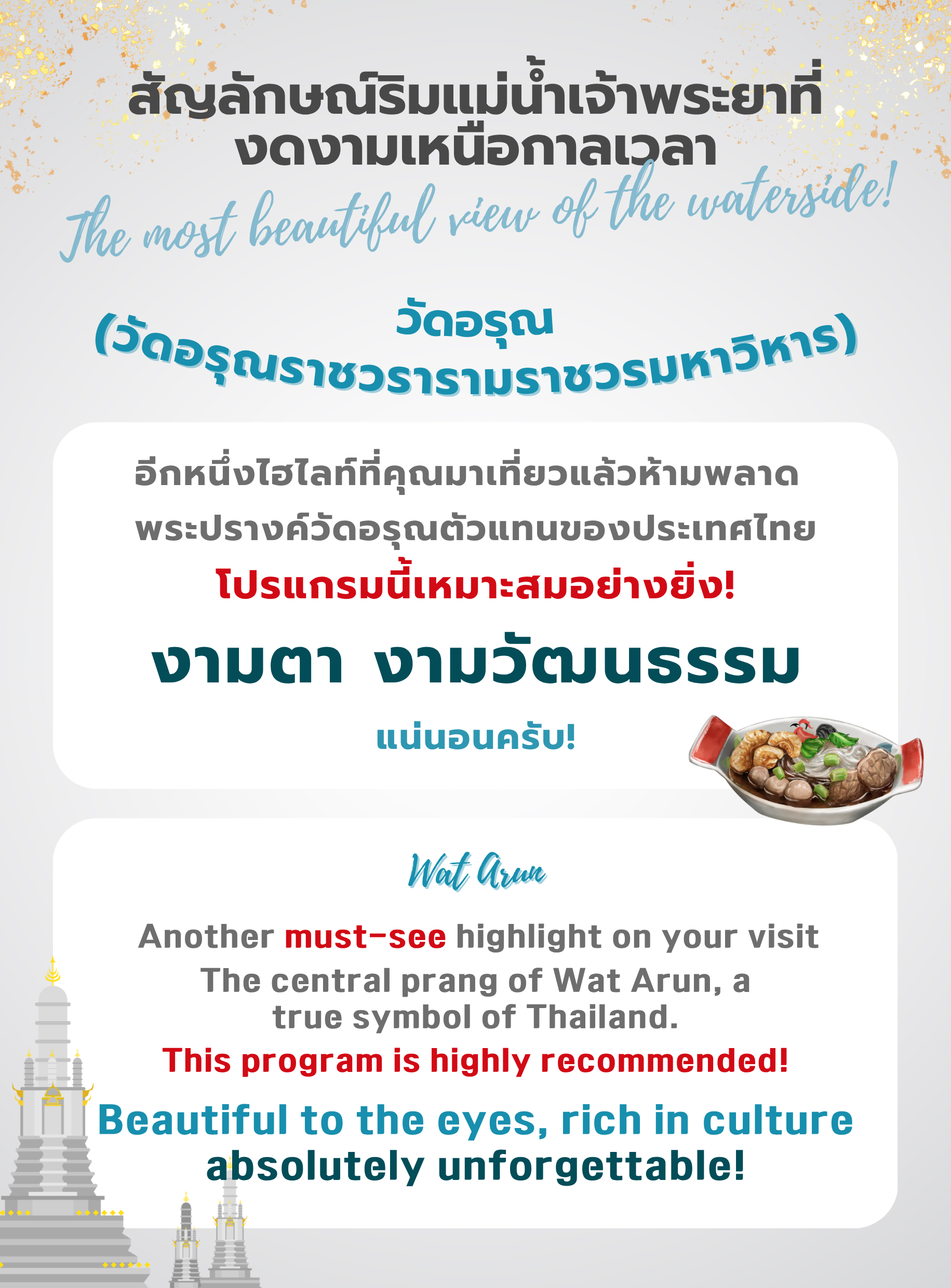 วัดอรุณ หรือ วัดอรุณราชวรารามราชวรมหาวิหาร ตั้งอยู่ริมแม่น้ำเจ้าพระยา ฝั่งธนบุรี กรุงเทพมหานคร เป็นวัดที่มีพระปรางค์สวยงามและเป็นเอกลักษณ์ สร้างขึ้นในสมัยอยุธยา แต่ได้รับการบูรณะใหม่ในสมัยรัชกาลที่ 2 และ 3 วัดอรุณถือเป็นหนึ่งในสัญลักษณ์ที่สำคัญของกรุงเทพฯ โดยเฉพาะพระปรางค์ที่มีความสูงและประดับด้วยกระเบื้องเคลือบหลากสี
