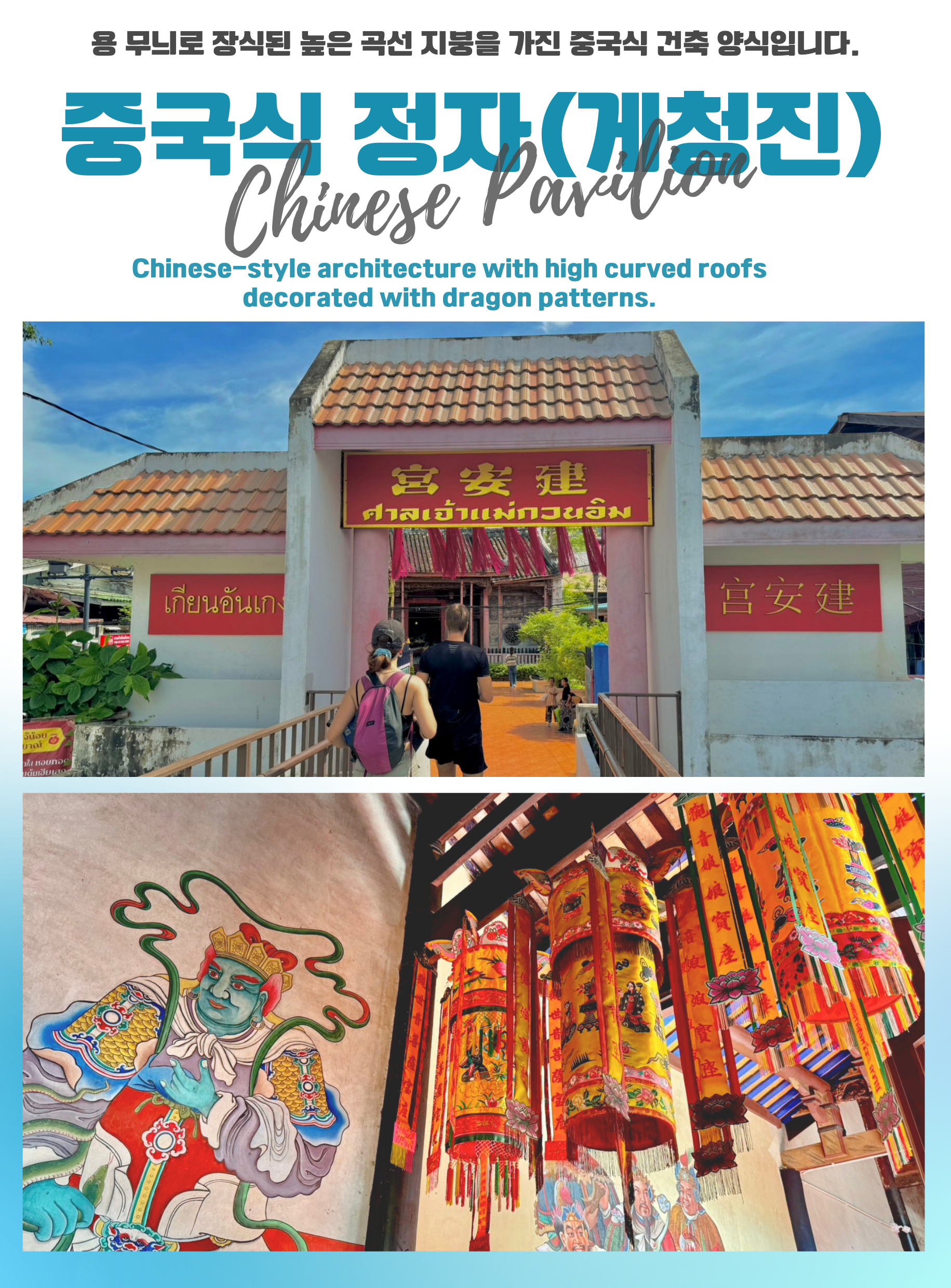 중국 정자(Geung Jin)는 전통적인 중국식 건축물로, 높은 곡선형 지붕과 용 무늬 또는 다른 문화적 상징들로 장식된 것이 특징입니다. 이러한 정자는 중국 사원이나 공공 장소에서 휴식처, 예배당, 또는 의식 장소로 자주 사용됩니다. 중국 정자의 설계는 자연과의 조화와 평화로운 삶을 강조하는 중국 철학을 반영합니다.