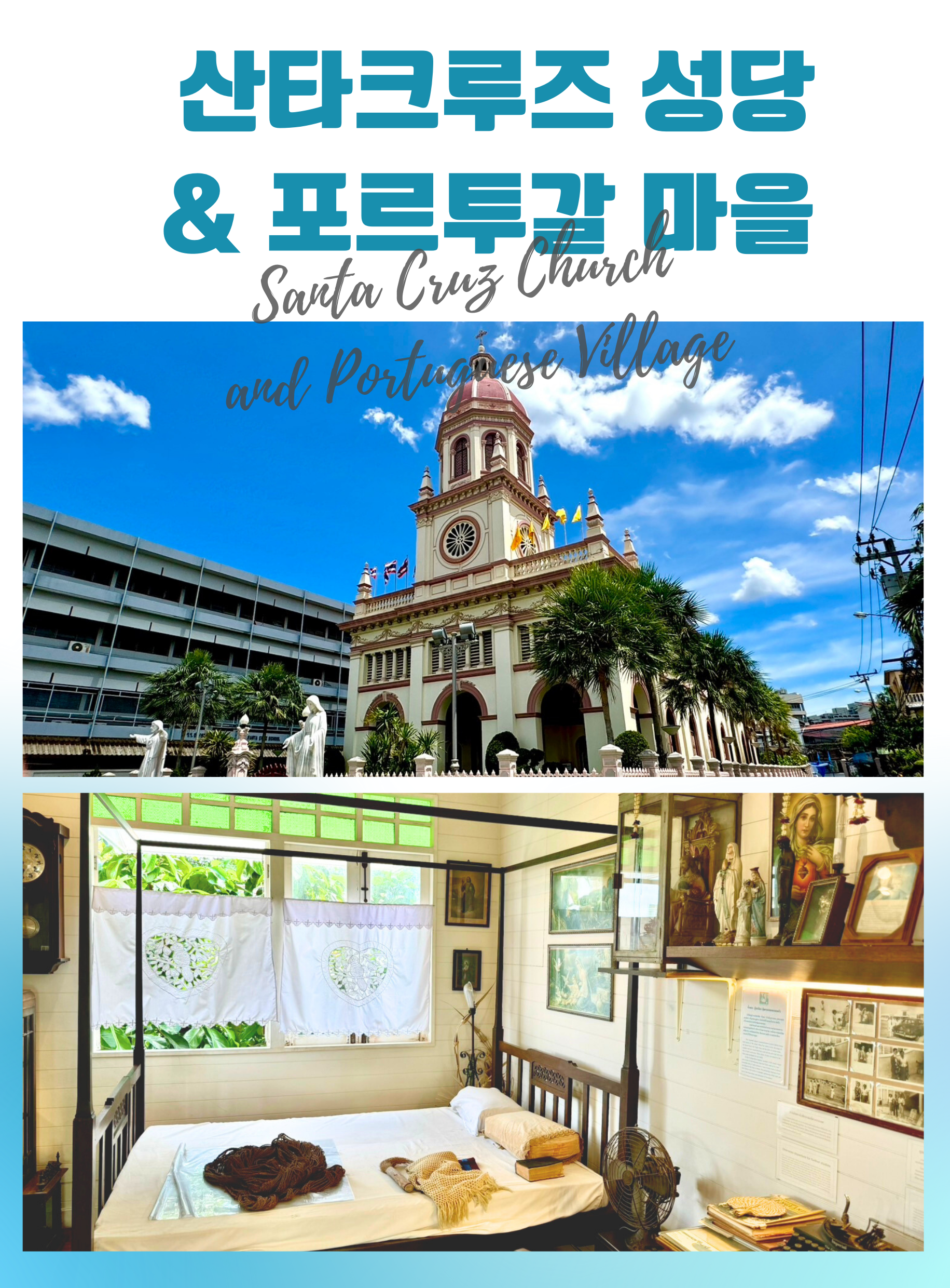 산타크루즈 성당 (Santa Cruz Church) 은 방콕 쿠디친 (Kudi Chin) 지역의 차오프라야 강변에 위치해 있습니다. 이 로마 가톨릭 성당은 라마 1세 시대에 버마와의 전쟁 후 태국에 정착한 포르투갈 이주민들에 의해 건축되었습니다. 성당은 유럽 건축 양식과 태국 예술 요소가 결합된 독특한 모습을 가지고 있으며, 그 상징적인 종탑이 특징입니다. 산타크루즈 성당은 수세기 동안 이어져 온 쿠디친 지역 기독교 공동체의 중심으로서 역사적, 문화적으로 중요한 의미를 지닙니다.
