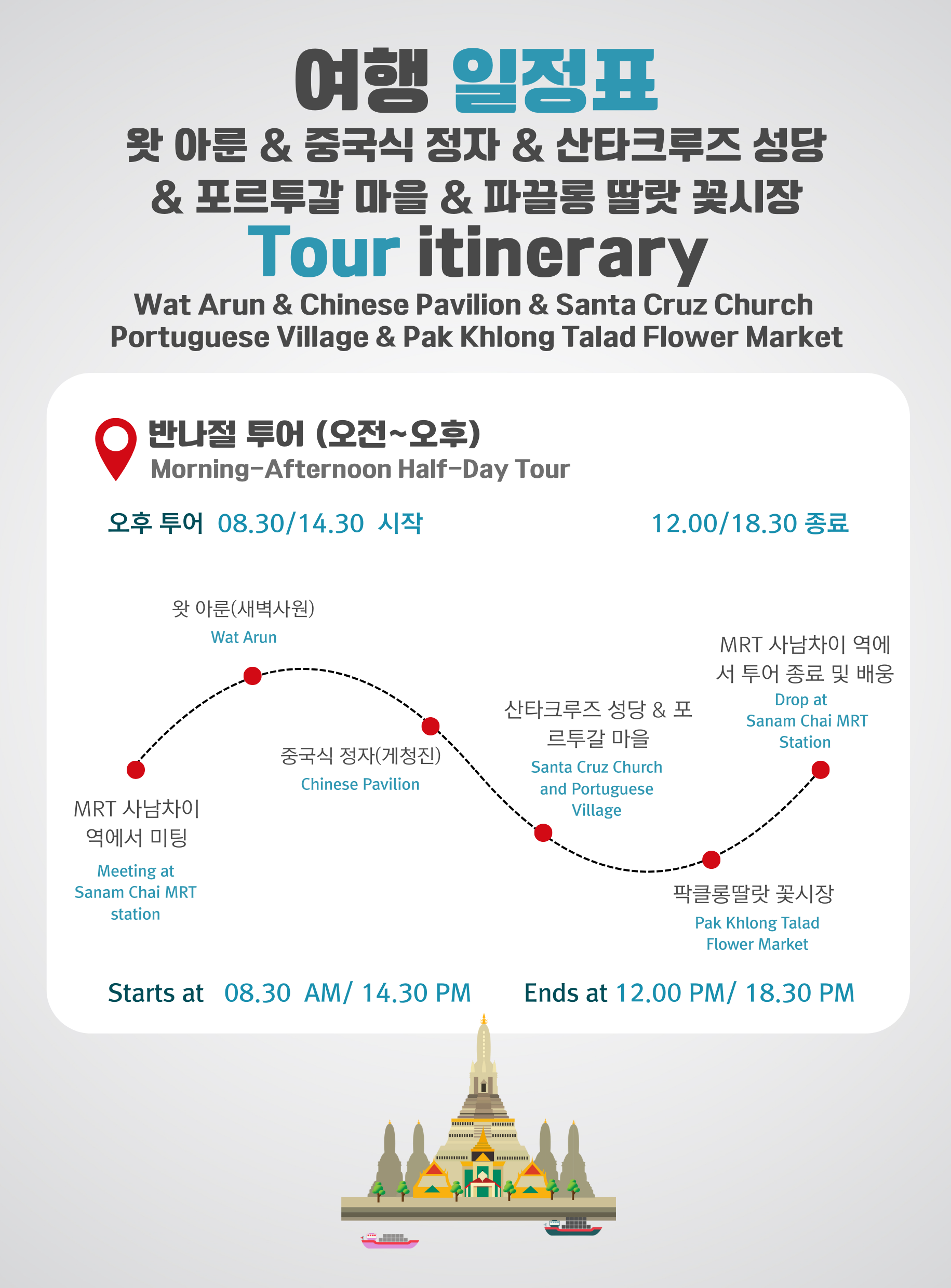 [반나절] 워킹 투어 - 왓 아룬 & 중국 사원 & 산타 크루즈 교회 + 포르투갈 마을 & 팍 클롱 탈랏