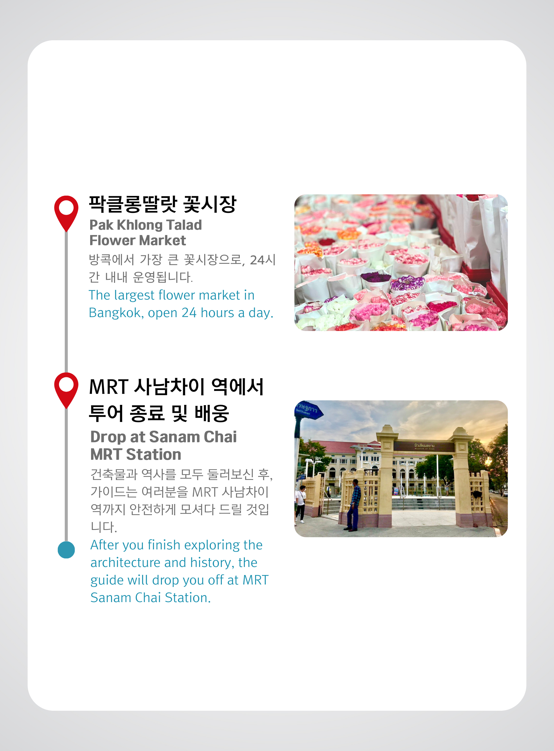 Pak Khlong Talat을 방문한 후 가이드가 친절하게 MRT Sanam Chai 역으로 안내해 드리고, 그곳에서 투어 프로그램이 마무리됩니다. 저희 서비스를 선택해 주셔서 감사드리며, 멋진 경험을 하셨기를 바랍니다!