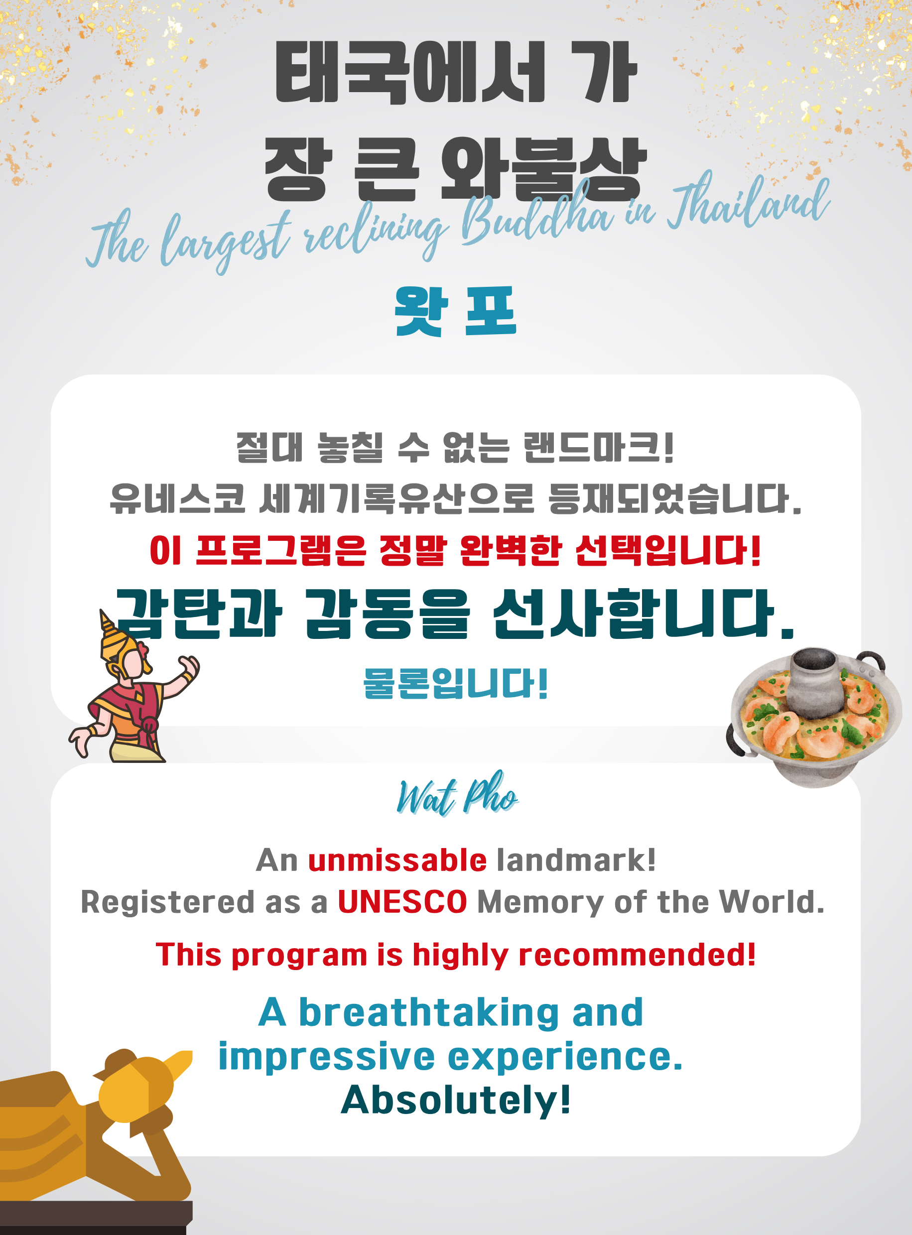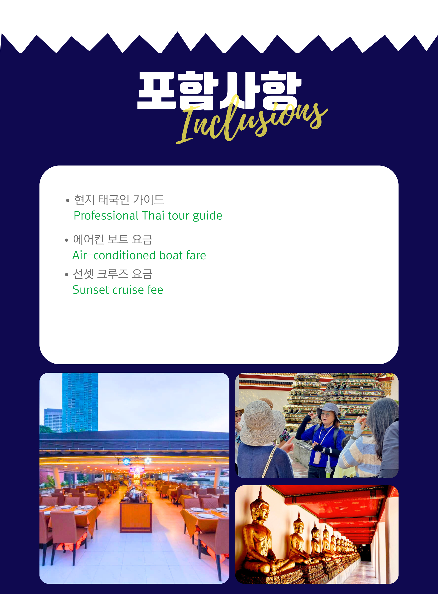 • 추가 요금(포함되지 않음): 왓 아룬 입장료 200 THB, 왓 포 입장료 300 THB