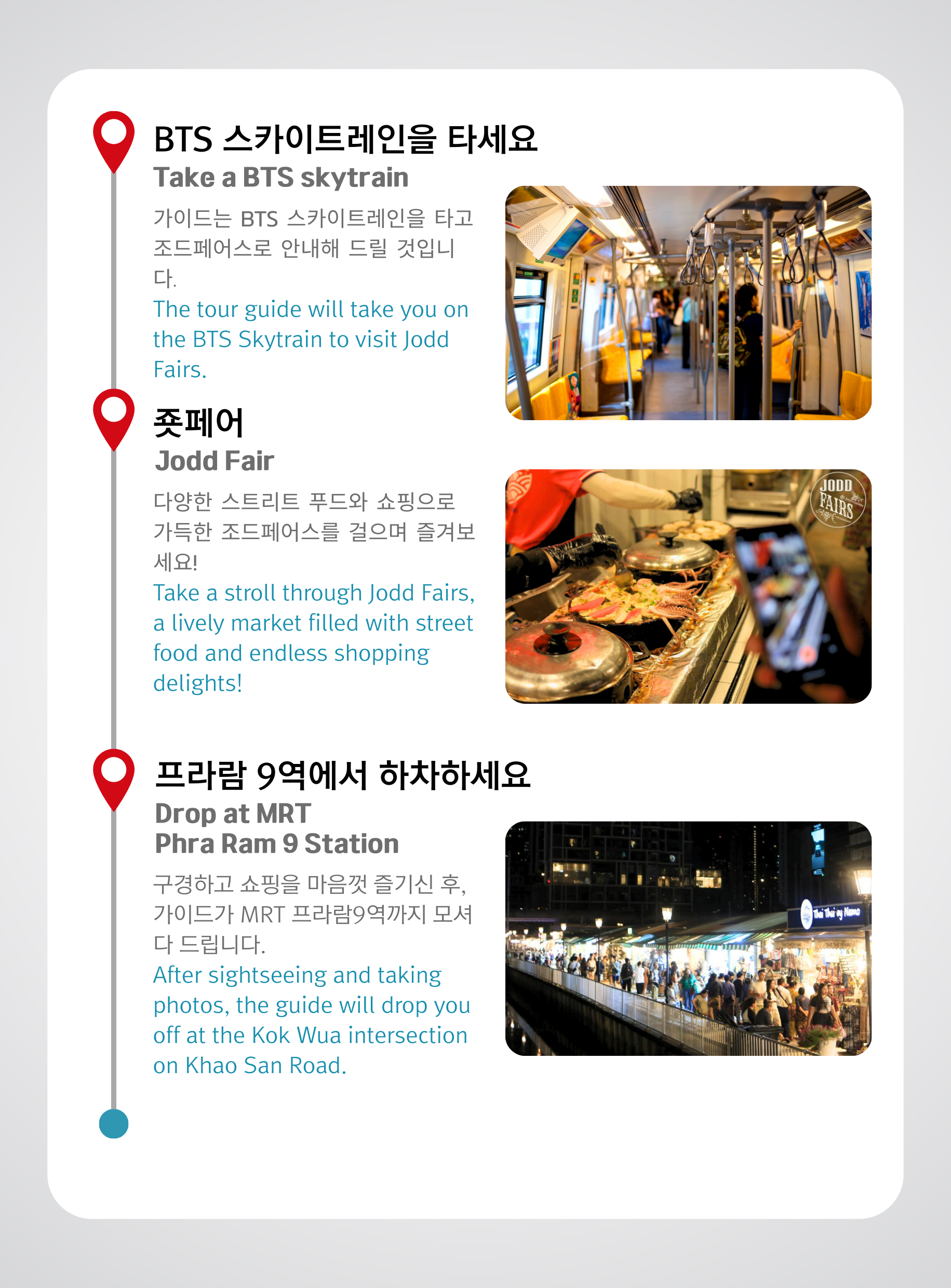 BTS 전철을 타고 ** 조드 페어 마켓 방문 조드 페어 마켓은 방콕의 인기 있는 야시장으로, 다양한 음식과 패션 아이템을 저렴한 가격에 구입할 수 있는 곳입니다. 또한, 태국의 문화와 음식을 경험할 수 있는 좋은 장소입니다.