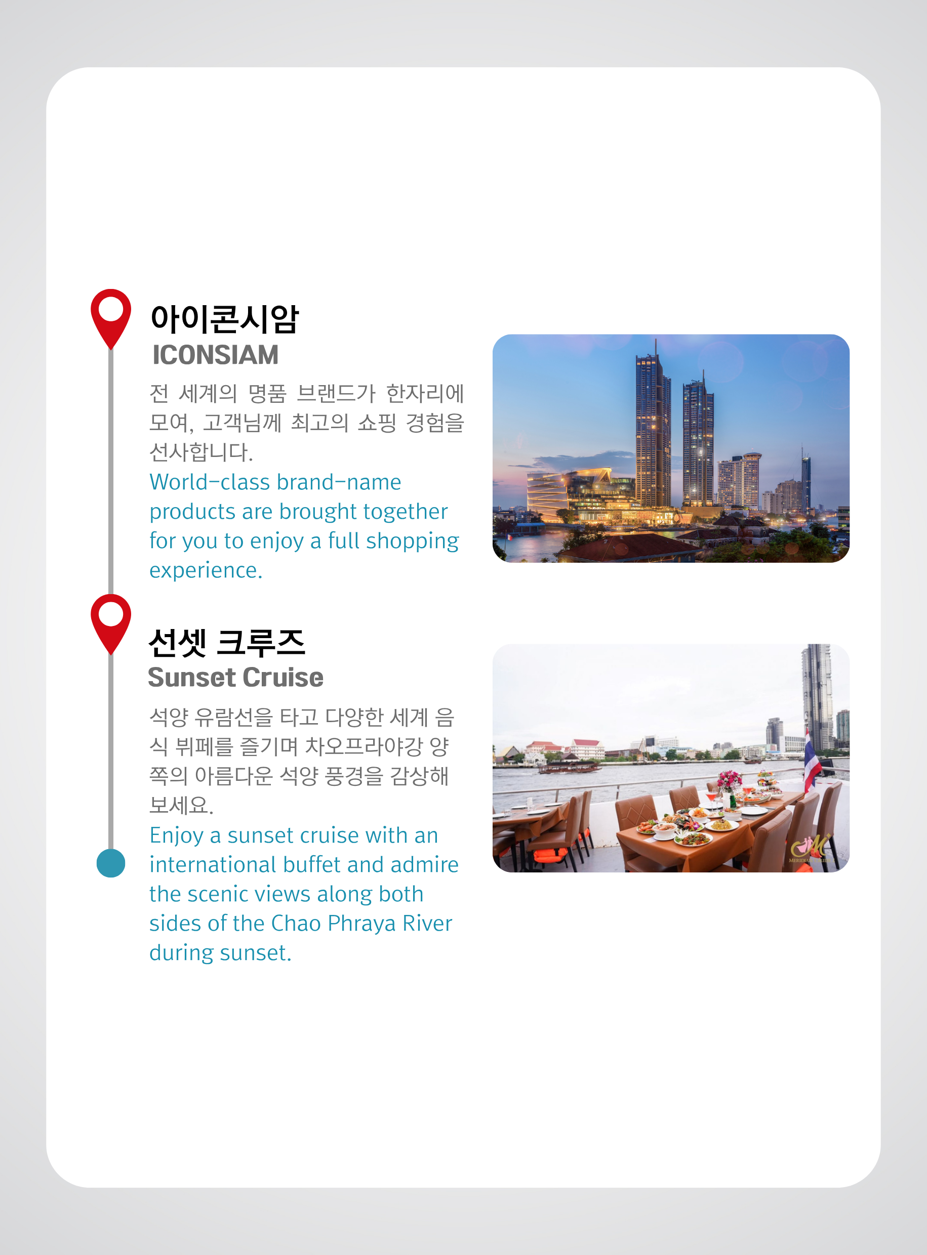 아이콘시암(ICONSIAM)은 방콕의 클롱산(Khlong San) 지역에 위치한 차오프라야 강변의 대형 고급 쇼핑 복합 단지입니다. 2018년에 개장한 아이콘시암은 여러 층에 걸쳐 있으며, 글로벌 럭셔리 브랜드부터 독특한 현지 제품까지 다양한 상품을 제공합니다. 주요 하이라이트 중 하나는 태국의 4개 지역 문화를 선보이는 "숙시암(SookSiam)" 구역으로, 태국 전역의 전통 음식을 맛볼 수 있습니다. 또한 아이콘시암에는 프리미엄 영화관과 태국 및 국제 미술 전시회를