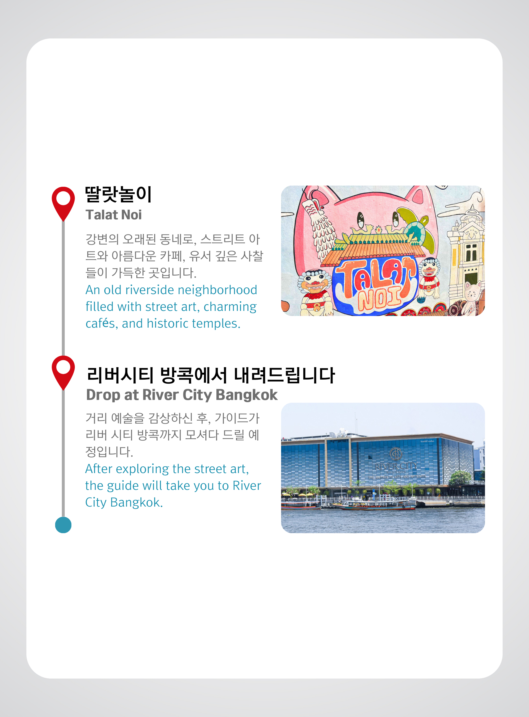 마지막으로, 여러분은 리버시티 방콕에서 투어를 마무리합니다.