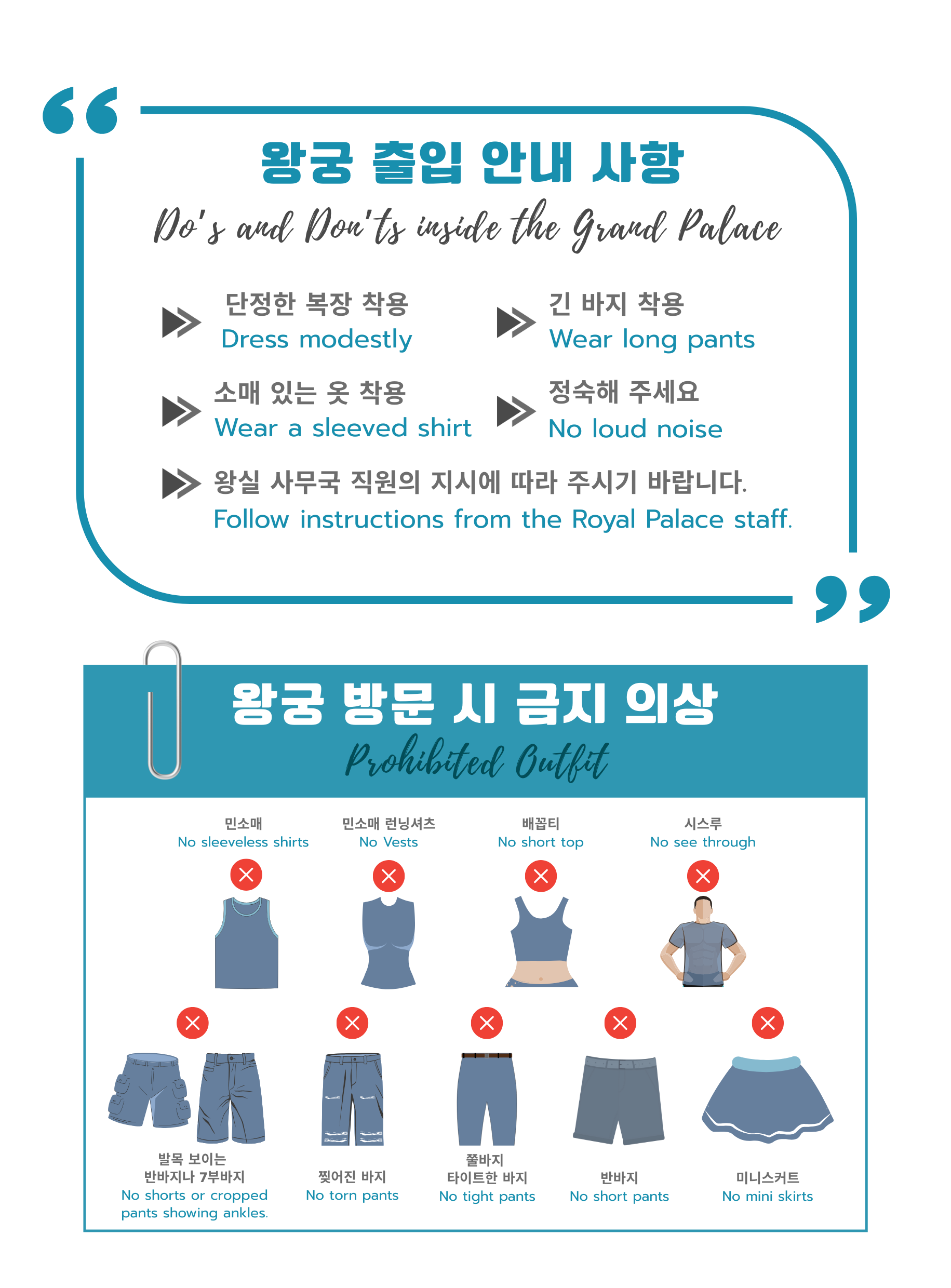 แต่งกายให้สุภาพ เรียบร้อย, สามารถใส่กางเกงขายาว หรือกระโปรงยาวได้, สามารถใส่เสื้อแขนสั้น หรือแขนยาวได้, ห้ามสวมใส่เสื้อแขนกุด เสื้อเอวลอย รัดรูป, ห้ามสวมใส่กางเกงขาด รัดรูป เล๊กกิ้ง, ห้ามสวมใส่ชุดไทยเปิดไหล่ แนะนำให้ใส่เป็นชุดไทยแบบสุภาพมิดชิด อาทิ ชุดไทยบรมพิมาน ชุดไทยจิตลดา เป็นต้น, ห้ามสูบบุหรี่