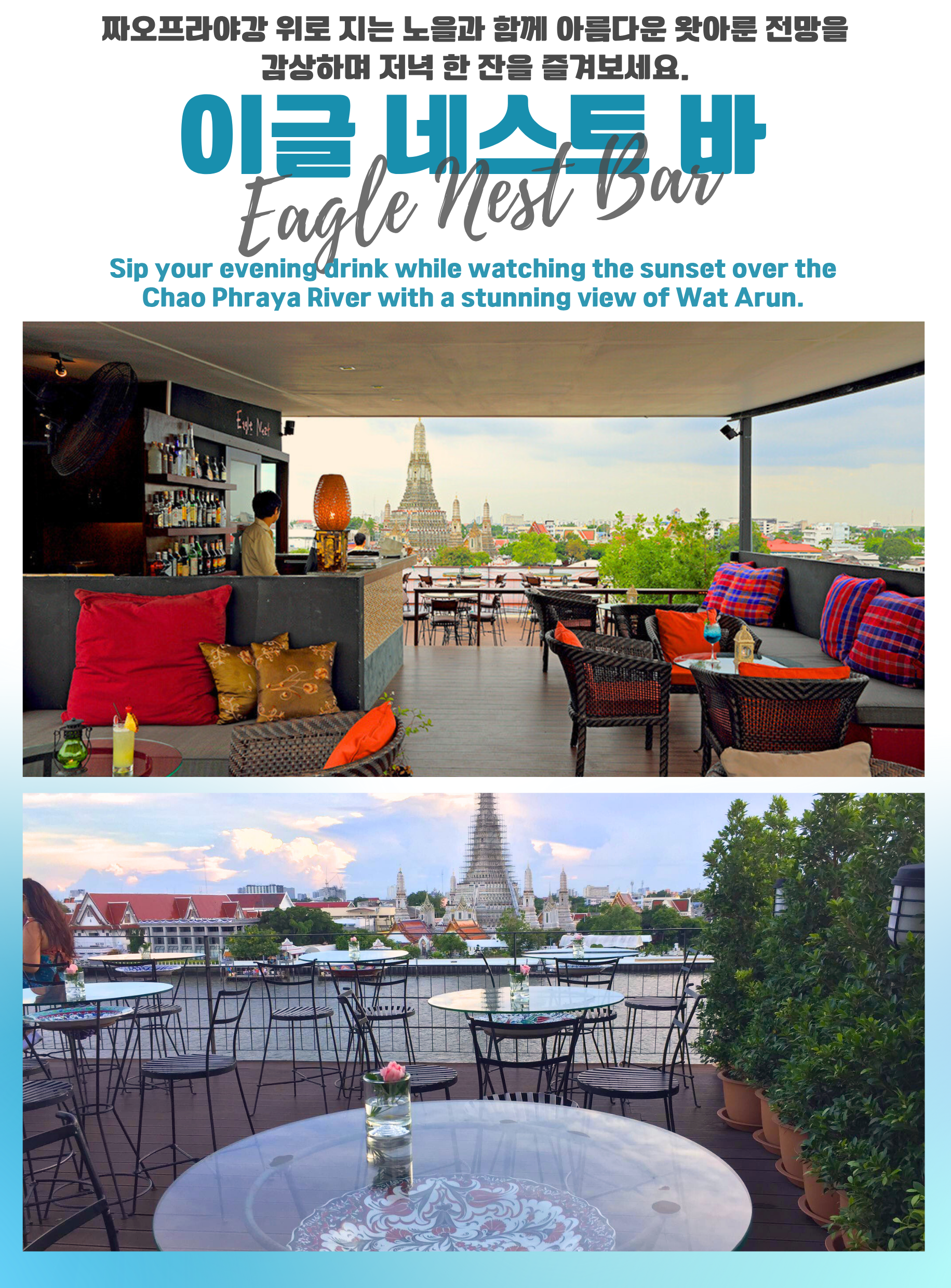 그 후 ‘이글 네스트 바’ (루프탑 바)로 이동합니다. 이곳은 찬란한 메콩 강과 왓 아룬, 왓 포를 내려다볼 수 있는 멋진 전망을 자랑하는 곳입니다.