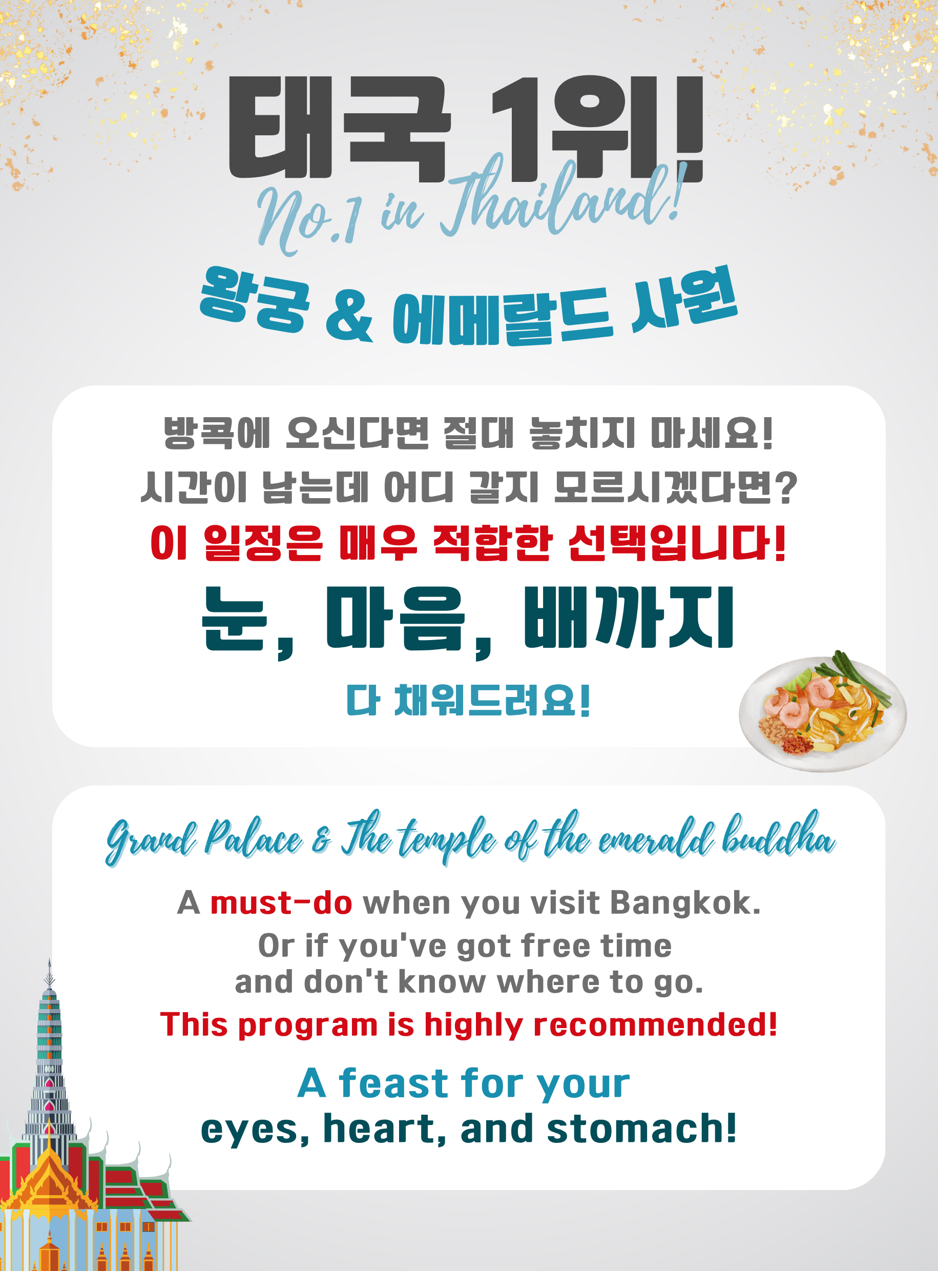 그 후 가이드는 여러분을 ‘왓 프라 시 라따나 사스다람’ (일반적으로 ‘왓 프라깨오’로 알려짐)으로 안내합니다. 이 사원은 방콕 왕조의 창립과 함께 2325년에 건립되었으며, 불교 사찰이자 태국 왕실의 중요한 상징입니다.