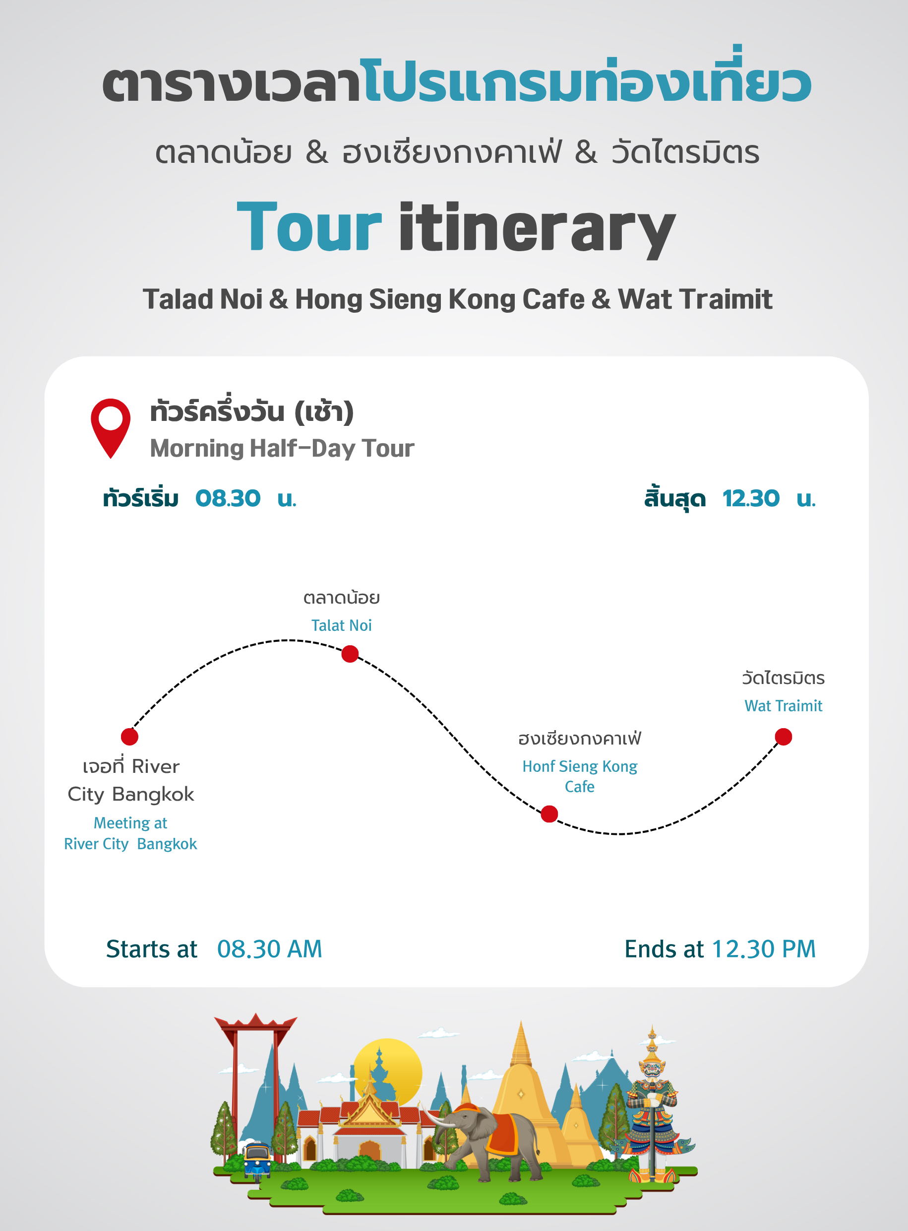 After your visit and taking a picture, your guide will kindly escort you to the front of Wat Traimit Withayaram where your tour program will conclude. Thank you for choosing our service, and we hope you had a wonderful experience!