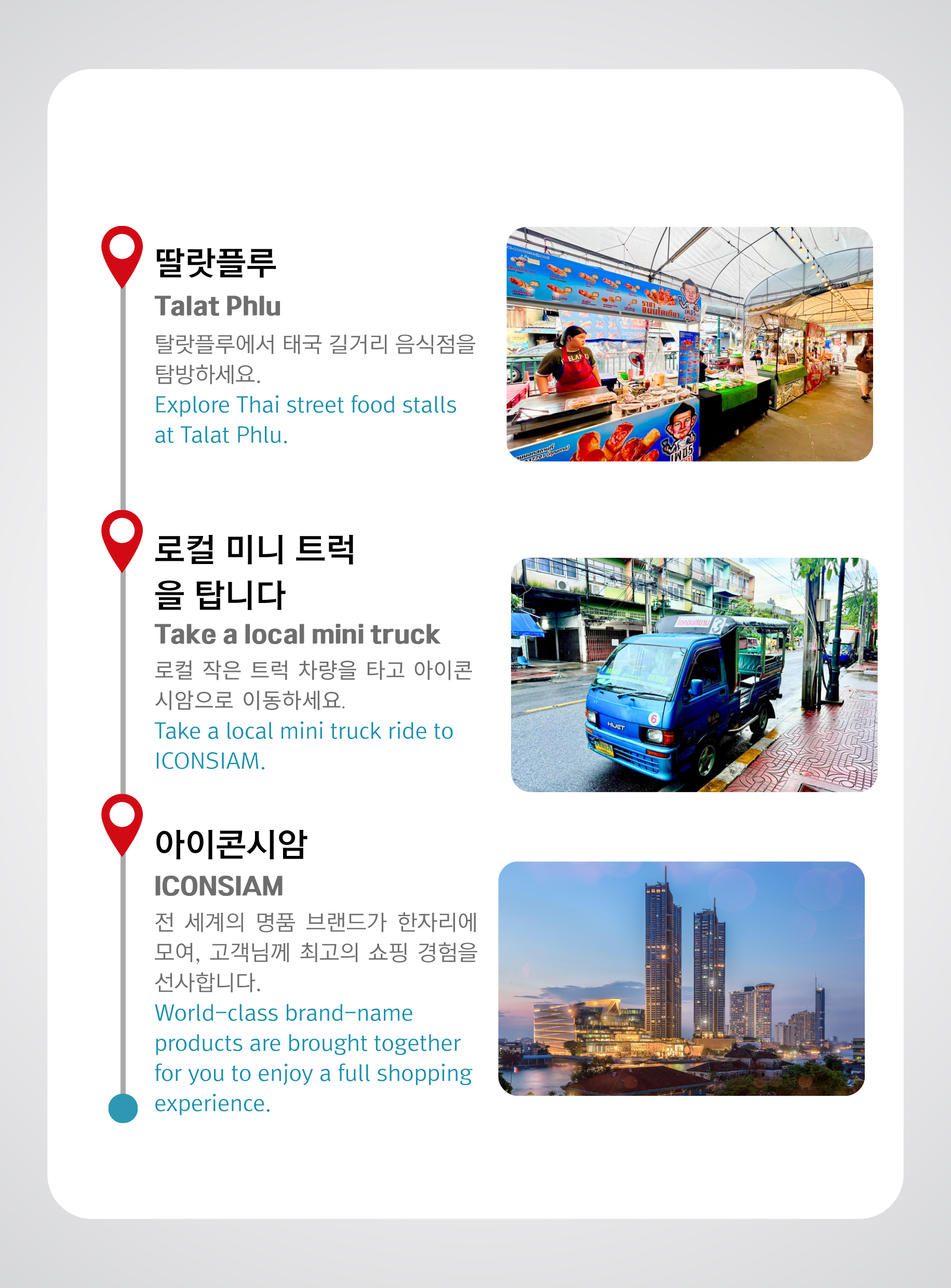 아이콘 시암 방문 후 가이드는 예약하신 호텔로 모셔다 드리며 투어가 종료됩니다. 저희 서비스를 이용해 주셔서 감사드리며, 멋진 경험을 하셨기를 바랍니다!