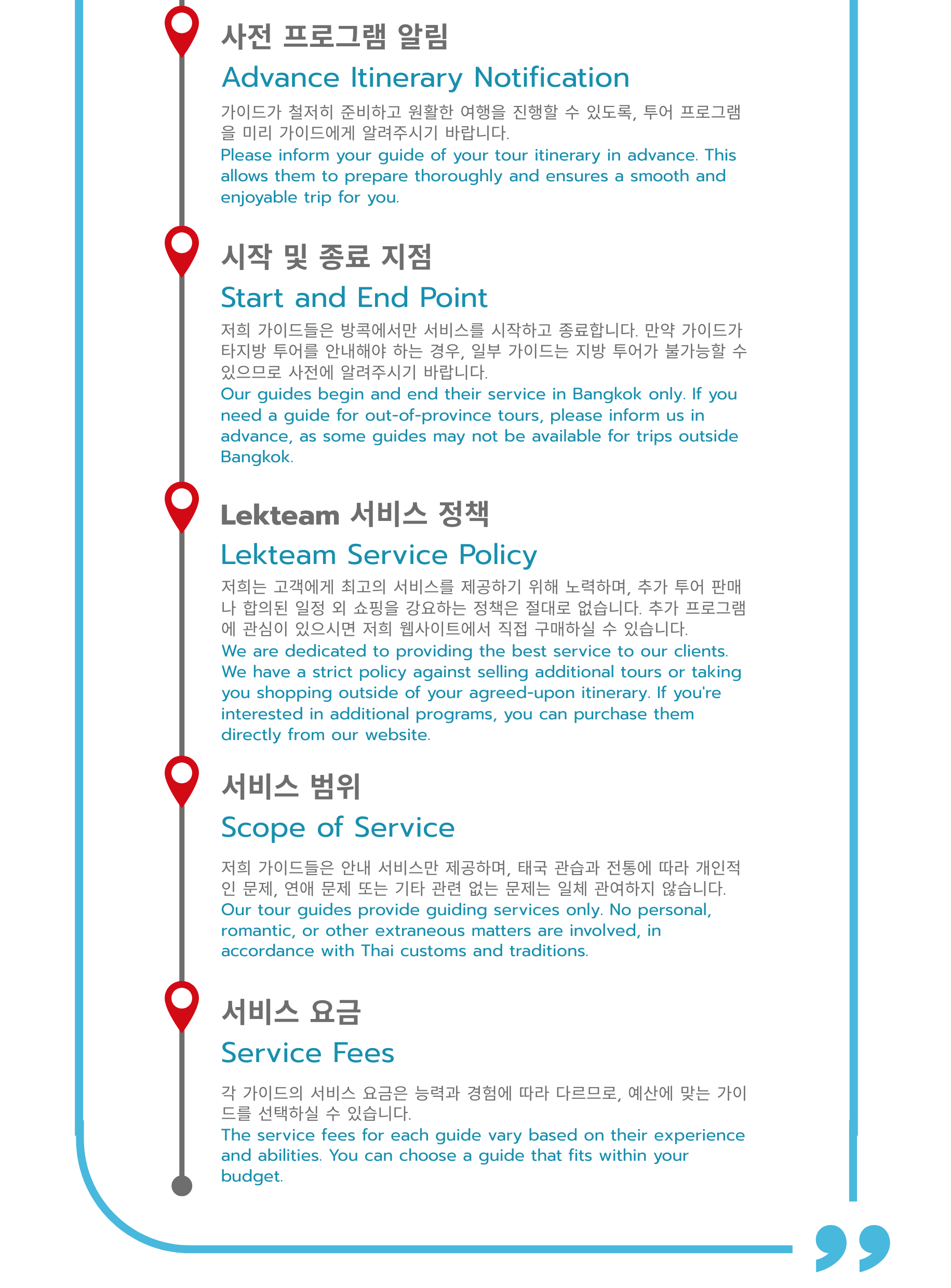 LEKTEAM은 태국 관광청의 정식 라이선스를 보유한, 태국어와 영어에 능통한 숙련된 가이드 서비스를 제공합니다. 우리는 진심을 다하고 정직하게 서비스를 제공하며, 여러분을 친척처럼 대하며 여행이 안전하고 안심할 수 있도록 최선을 다합니다. 여러분의 맞춤형 여행 일정과 방문하고 싶은 장소에 맞춰 기꺼이 안내해 드립니다.